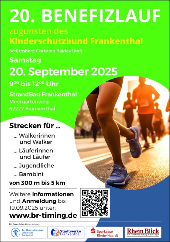 Der 20. Benefizlauf des Kinderschutzbund Frankenthal findet am Weltkindertag, Samstag, den 20. September 2025 im Strandbad Frankenthal statt.
